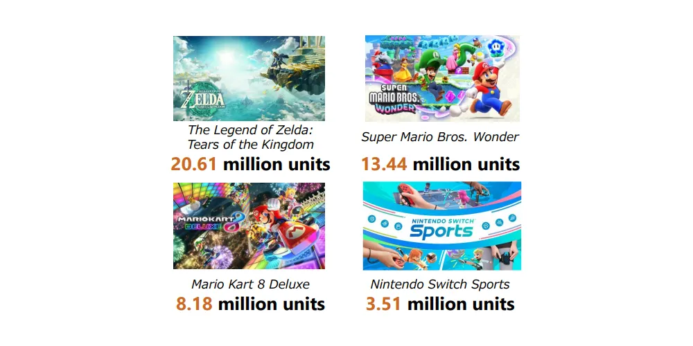 Nintendo ให้ข้อมูลว่าเครื่องเกม Nintendo Switch ทำยอดขายไปกว่า 141.32 ล้านเครื่องแล้ว โดยขายได้ 15.7 ล้านเครื่องในปีที่ผ่านมาแม้จะเข้าสู่ช่วงปลายเจนฯ ก่อนเปิดตัวรุ่นใหม่ปีหน้า ส่วนฝั่งซอฟต์แวร์ (เกม) กลุ่ม first-party ที่ขายดีที่สุดของปี 2023 คือ The Legend of Zelda: Tears of the Kingdom จนขึ้นมาติดทำเนียบท็อป 10 เรียบร้อย ในขณะที่เบอร์ 1 ยังเป็น Mario Kart 8 Deluxe เจ้าเดิม ที่ทิ้งห่างเกมอื่นไปพอสมควร