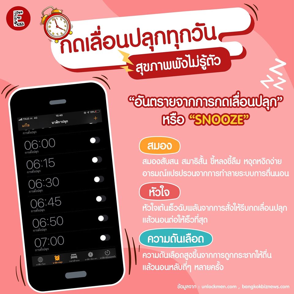 นาฬิกาปลุกร้องทีไร รู้สึกขี้เกียจตื่นทุกที ถ้ายังพอมีเวลานอนต่ออีกนิด เราก็มักจะ กด Snooze เพื่อเลื่อนเวลาปลุกออกไปอีกนิด จะได้ได้นอนเพิ่มขึ้นอีกสักหน่อย แต่รู้หรือไม่ ว่าการกดเลื่อนเวลาปลุกแบบนี้บ่อยๆ จนติดเป็นนิสัย จะยิ่งส่งผลเสียต่อตัวเรามากมาย อย่างที่เราคาดไม่ถึง มาดูกันว่า ทำไมเราจึงไม่ควรเลื่อนเวลาปลุกบ่อย ๆ